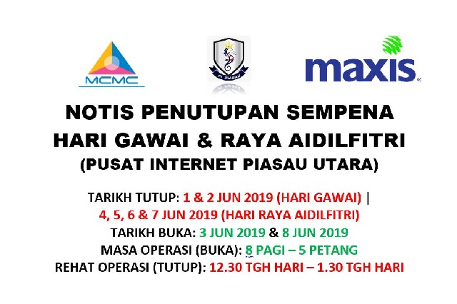 Berikut adalah notis penutupan Pusat Internet bersempena Cuti Perayaan Hari Gawai dan Hari Raya Aidilfitri 2019